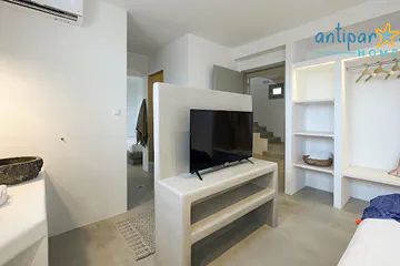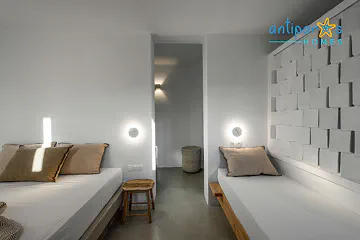 The bright rays of the sun and transparent light penetrate from everywhere into the space. Soft hues on the walls relax and give peace. The terrace with the pergola offers a magnificent view and the privilege of waking up in the morning facing the sea and the Chora.